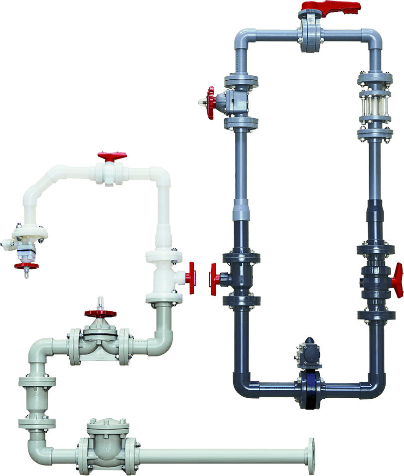 閥門系列產品如:隔膜閥、蝶閥、球閥、截止閥、止回閥、耐腐蝕泵等。主要材質有CPVC、UPVC、PVDF、PPH、FRPP等。